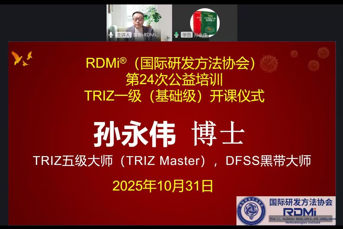 2025年11月9日,RDMi®(国际研发方法协会)第24次TRIZ创新方法一级在线公益培训圆满落幕!这也是本年度第6场公益培训,累计参训人数已突破7000+,持续推动创新方法的普及与应用,让更多人真正走进创新方法、掌握创新逻辑。
