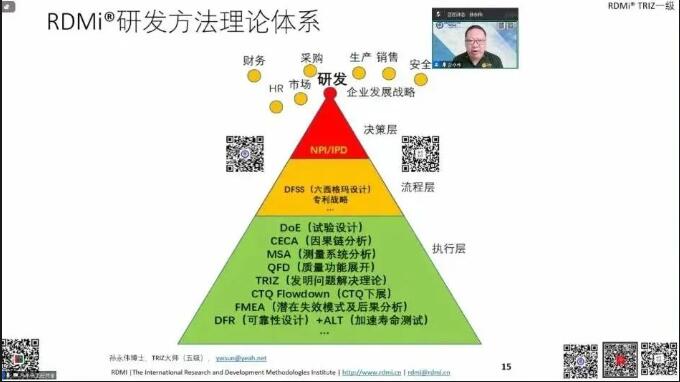 本次培训以线上形式开展,依托小鹅通平台,采用TRIZ五级大师(TRIZ Master)、DFSS黑带大师、研发方法理论体系提出者孙永伟博士于2025年5月录制的视频,并由RDMi®三级及以上实战与教学经验丰富的专家进行实时讲解与深度答疑。通过大量企业实战案例拆解,直观展现TRIZ创新方法的强大威力与实用价值。培训内容深度融合了孙永伟博士及RDMi®方法论专家团队近年来在实战中研发的最新成果,涵盖新工具、新理论、新路线图及新案例,其亮点纷呈:包括现代TRIZ理论赋能AI高效运用、RDMi®现代TRIZ理论的创新路线图(2025版)、大量的企业创新实战案例分享、可操作性更强更易掌握的新工具和新术语、更易掌握的在不降低质量前提下的大幅降本策略及实例、RDMi®最新专利规避和布局战略等,是具有完全自主知识产权的#现代TRIZ理论知识体系。