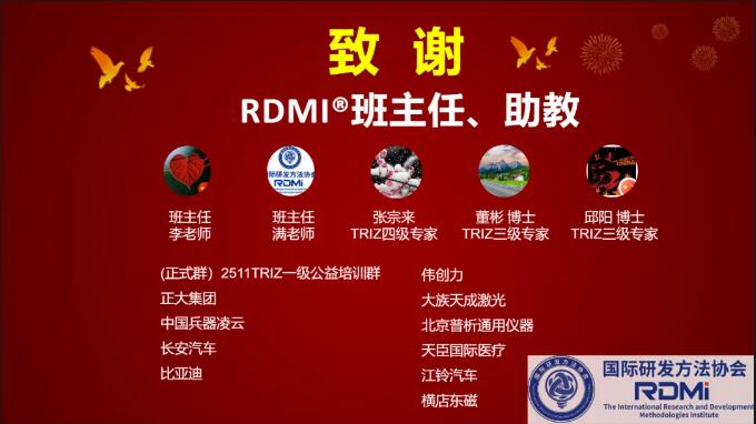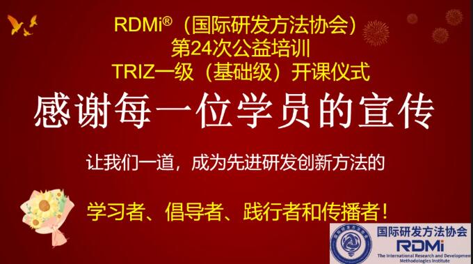 RDMi®持续举办公益培训,以切实行动赢得研发方法爱好者的广泛赞誉与社会各界的大力支持。当前,中国企业普遍面临方法论缺失的挑战,而创新需求却日益迫切,亟需培养掌握先进方法论的专业人才。实践充分证明,TRIZ理论是提升企业研发效能的利器,能显著提高研发效率与质量,缩短研发周期,降低成本。然而,TRIZ的学习与应用是一个需要长期坚持、持续精进的过程。RDMi®始终以培养创新型人才、提升社会整体创新能力为使命,致力于解决企业研发中从战略规划到具体执行各层面的痛点问题,全面提升企业研发水平。展望未来,RDMi®将系统性地组织涵盖DFSS(六西格玛设计)、DoE(试验设计)、TRIZ(发明问题解决理论)、FMEA(潜在失效模式及后果分析)、专利战略等前沿方法论的系列培训与项目指导工作。我们诚挚期待与您携手,共同探索这些创新方法,赋能企业提升核心竞争力!诚邀共赴创新之旅,敬请期待!