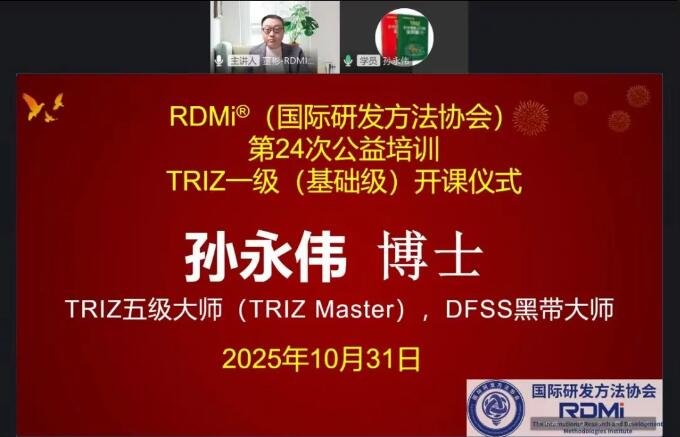为提升学习效果,RDMi®于10月31日晚特别举办线上开课仪式。本次直播由RDMi®TRIZ三级专家董彬博士主持,特邀孙永伟博士作为嘉宾出席。仪式伊始,孙永伟博士在致辞中阐述了TRIZ培训的核心价值,鼓励学员们学以致用。他指出,该方法已在众多企业的成功实践中证明,能帮助工程师解决常规方法无法攻克的难题,从而极大提升创新能力。正因如此,RDMi®TRIZ一级公益培训的规模已从最初的两三百人发展到如今的一两千人,企业团体报名的踊跃也充分印证了业界对创新方法的重视。RDMi®举办公益培训的初衷在于打破学习壁垒,让更多人无门槛地接触并了解其价值,并以此为起点,期待未来能与有需要的企业和个人进行更深入的合作,共同创造更大的效益。