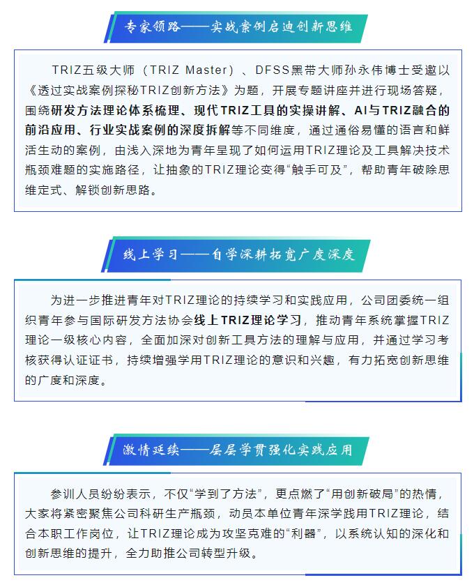 萃智启航,青年先锋。公司团委将持续优化青年学用TRIZ理论路径,坚持问题导向,突出实践应用,积极搭建青年学习交流平台,加强工作协同,凝聚创新合力,切实引导青年为公司高质量发展贡献青春智慧和创新动能。