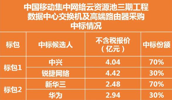 2021年6月28日,中国移动发布《中国移动集中网络云资源池三期工程数据中心交换机及高端路由器采购_中标候选人公示》。
